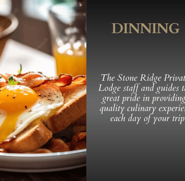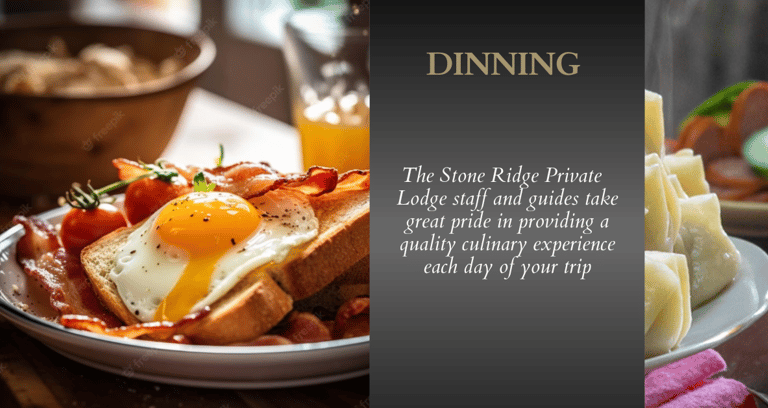 The Stone Ridge Private Lodge staff and guides take great pride in providing a quality culinary experience each day of your trip. Each day, breakfast will be served in the main lodge and typically consists of oatmeal or porridge, bacon, eggs, coffee, and tea. Lunch will be served on the river each day including sandwiches, cold cuts and a variety of different snacks to keep you going on the water. Each evening, dinner will be served family-style and is a staple meal each evening, consisting of soups, a variety of different meats and plenty of sides and vegetable dishes.